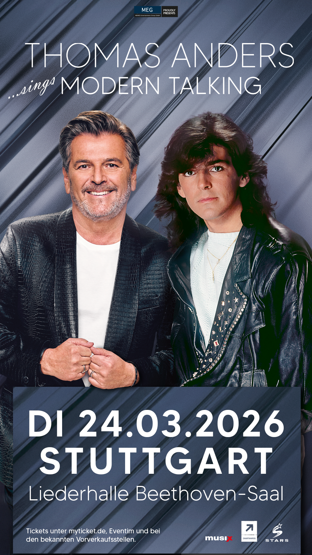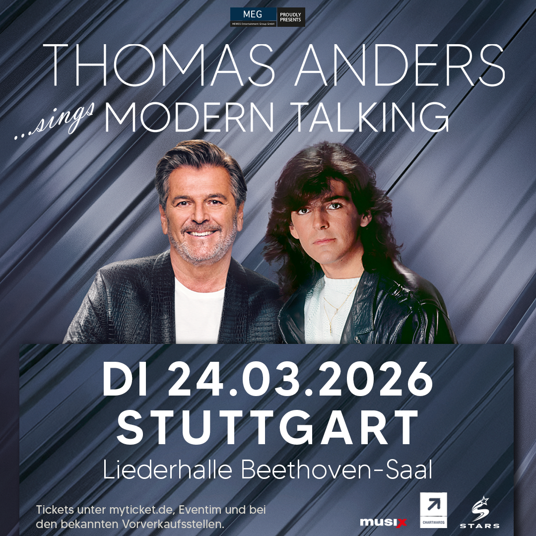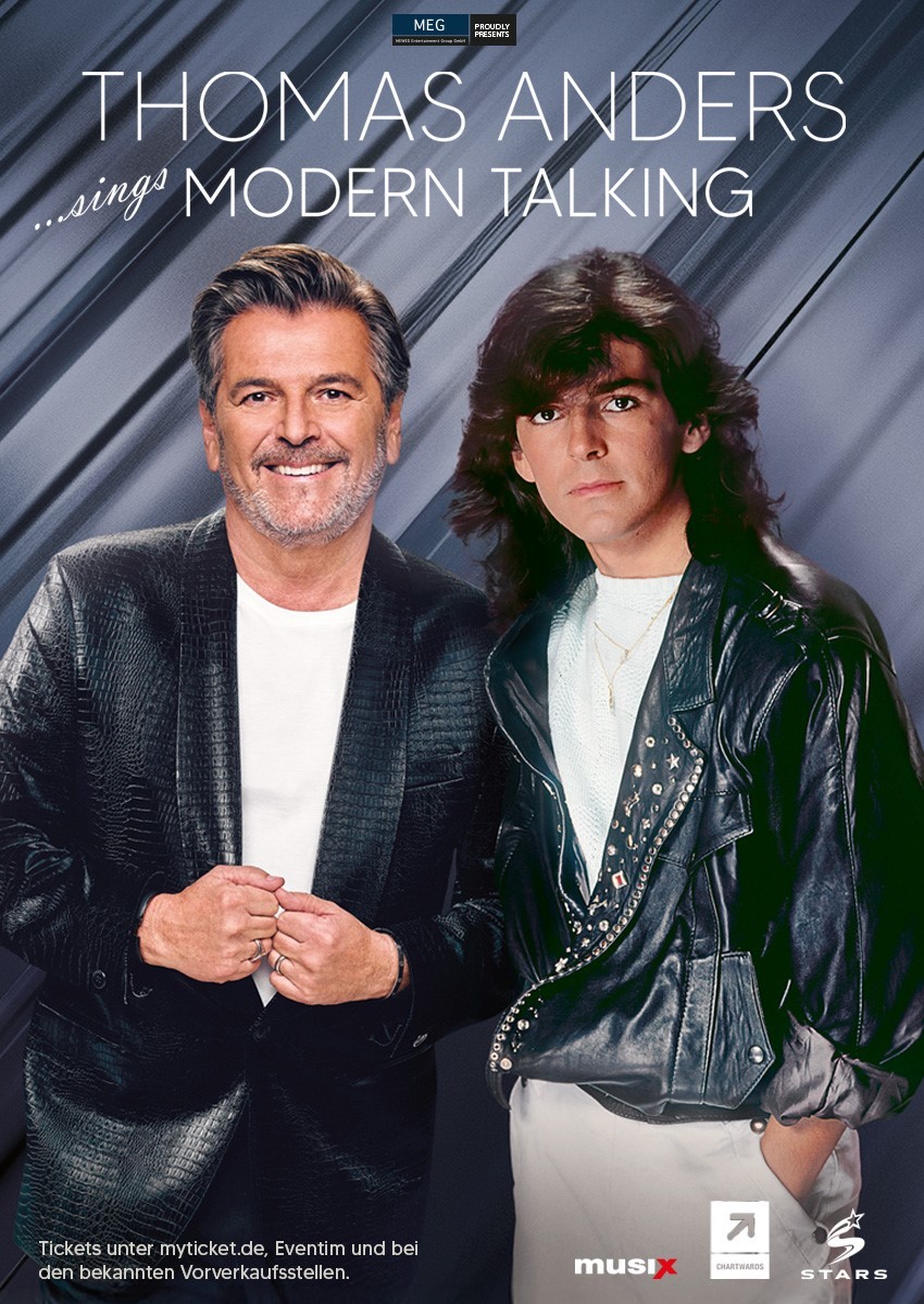 Zum 40-jährigen Jubiläum von Modern Talking überrascht Thomas Anders seine Fans im März 2026 mit einer spektakulären Deutschland-Tournee, die die unvergesslichen Hits des legendären Pop-Duos sowie weitere Klassiker der 80er Jahre feiert. Die „THOMAS ANDERS sings MODERN TALKING-Tour“ ist nicht nur (s)eine liebevolle Hommage an die Musik eines der beliebtesten und prägendsten Musikjahrzehnte, sondern auch eine Premiere für die sensationellen Neuaufnahmen der ersten sechs Modern-Talking-Alben. Damit ist der Künstler der erste seiner Art, der sein komplettes Frühwerk neu interpretiert und damit auf Tour geht!